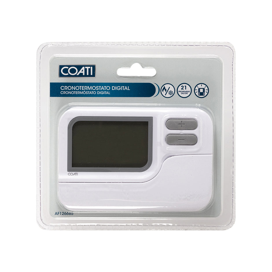 El cronotermostato programable de calidad COATI es especialmente útil si se tiene centralizado el sistema de calefacción y aire acondicionado en el hogar. Es el termostato que ofrece mayores posibilidades de confort en el hogar ya que permite programar una temperatura de funcionamiento para cada día de la semana, permitiendo copiar programas ya diseñados. Entre las múltiples funciones que ofrece, cabe destacar el modo Vacaciones que permite parar la programación durante hasta 99 días.