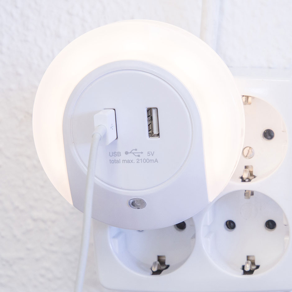 El enchufe USB blanco de la marca SIMON BRICO con 2 puertos USB 2,1 Amperios es la solución ideal para conectar de manera simultánea tus dispositivos electrónicos. Además, dispone de un punto de luz adicional de detección crepuscular. El adaptador cuenta con tres modos de funcionamiento ON/OFF/AUTO con una iluminación en modo automático de 6 lúmenes y en modo ON de 9 lúmenes. Ideal para aportar un pequeño punto de luz en las habitaciones infantiles.
